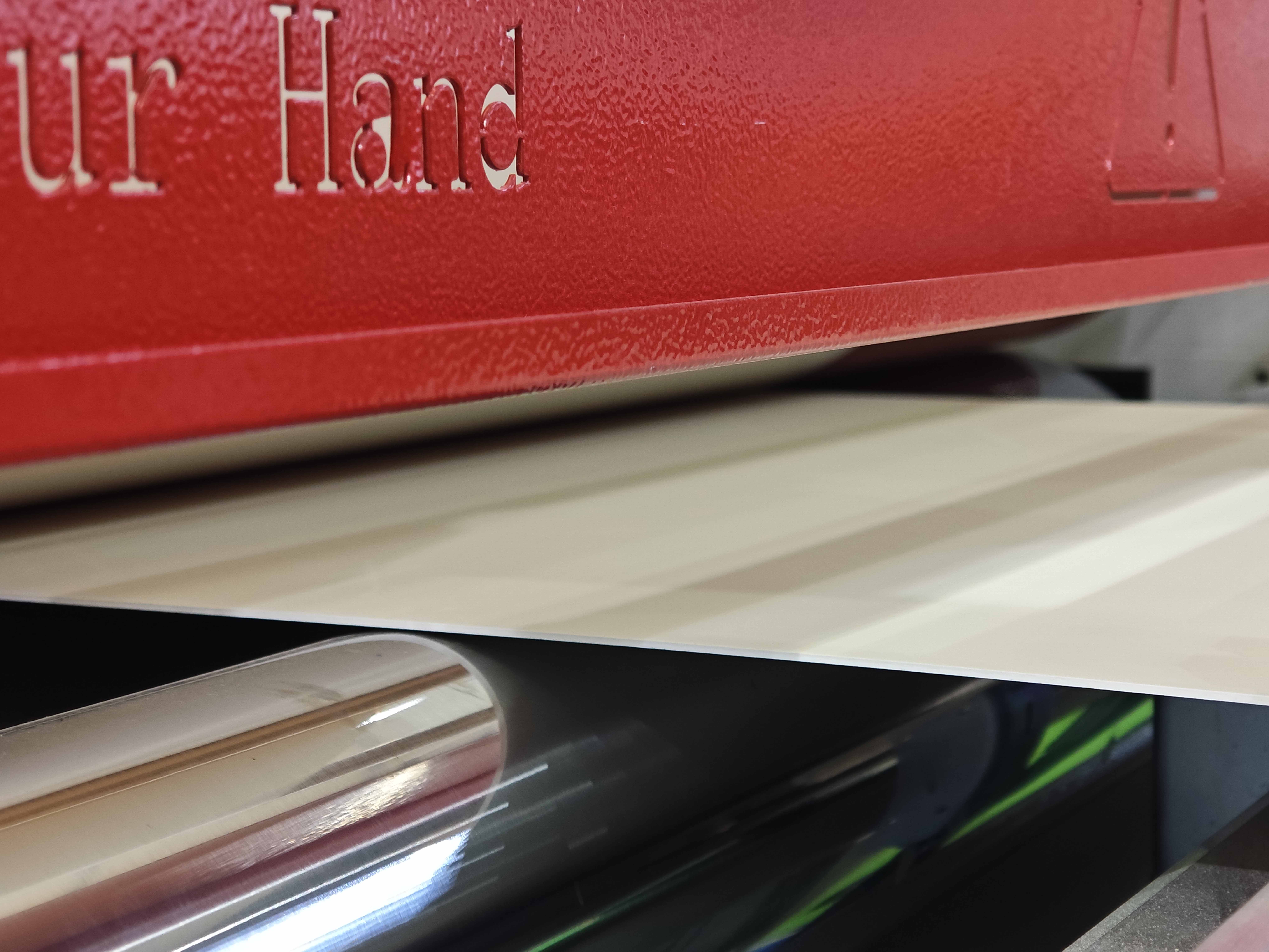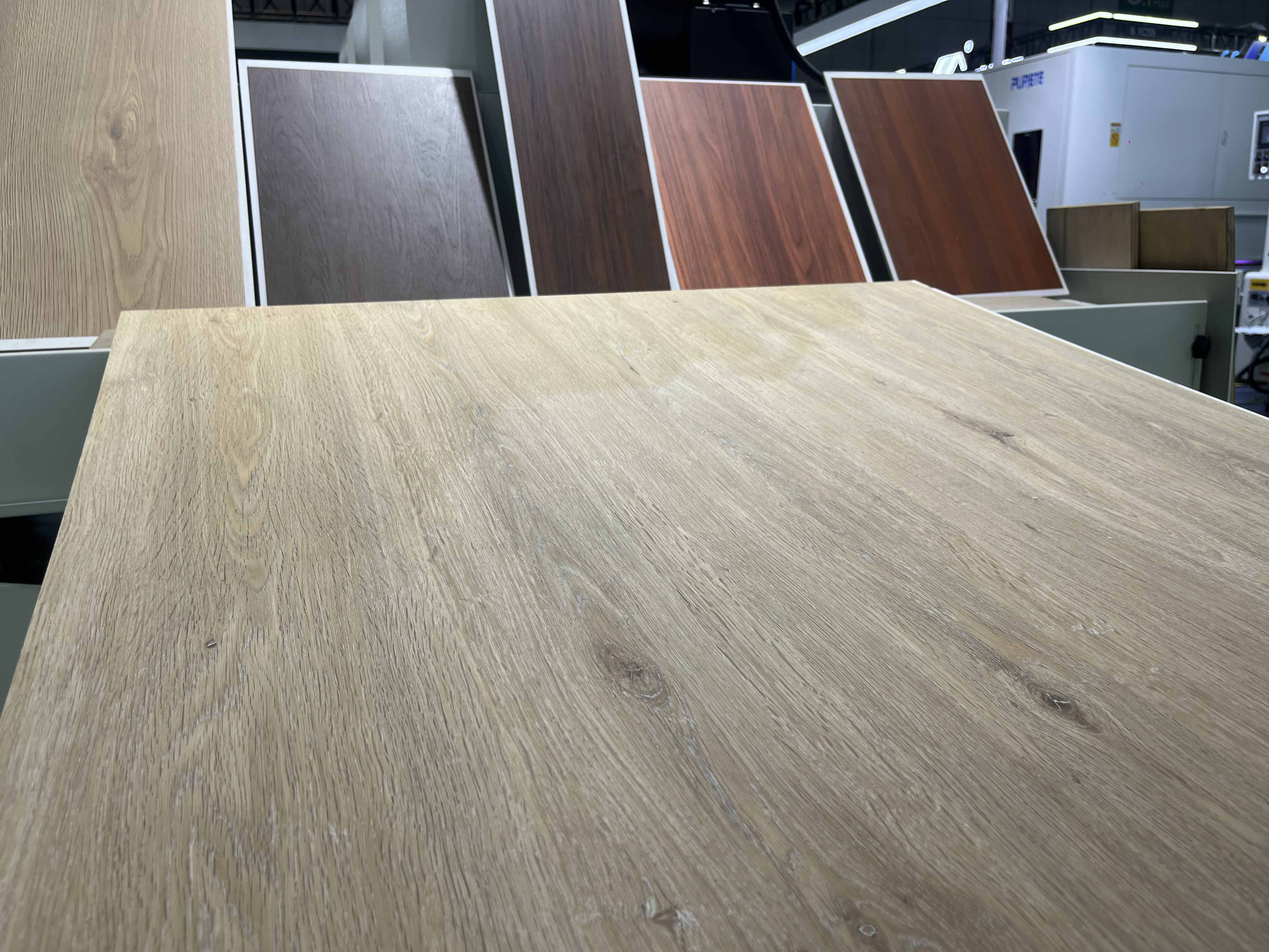 【涂飾仿真同步壓紋生產(chǎn)線】: SPC地板、PET地板可以采用設(shè)備實現(xiàn)精準定位,較傳統(tǒng)工藝提升5倍,圖案和紋理的天然仿真還原度達90%以上,以極低的成本,復(fù)刻實木地板的質(zhì)感與紋理,產(chǎn)品品質(zhì)不變,減少設(shè)備的投入,快速占領(lǐng)市場。
