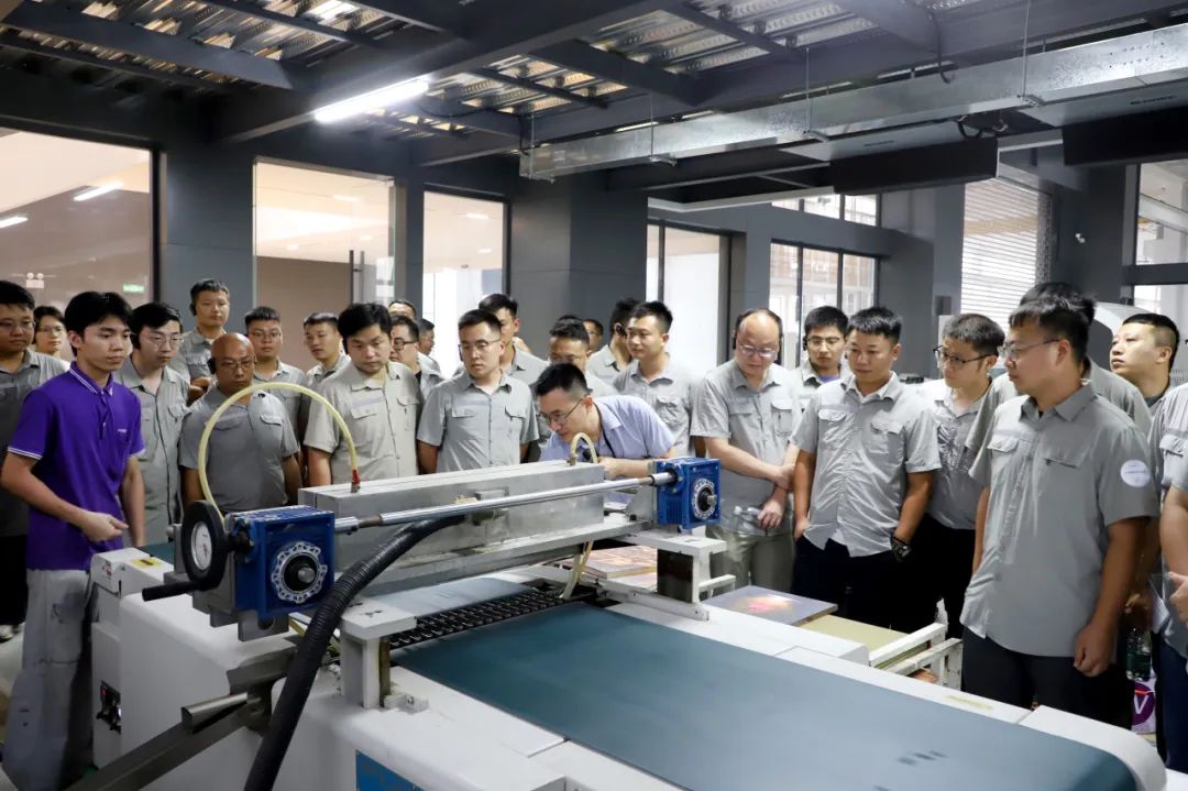 考察團(tuán)分成兩組深入生產(chǎn)一線,開(kāi)啟深度參觀。在專業(yè)引導(dǎo)員的引領(lǐng)下,從機(jī)加車間到裝配1車間,再裝配3車間內(nèi),先后參觀了輥涂、淋涂、噴漆、平貼、平壓等各個(gè)產(chǎn)線設(shè)備。這些先進(jìn)的設(shè)備和智能化的生產(chǎn)流程,讓工程師們對(duì)表面涂飾工藝有了更直觀的認(rèn)識(shí),也感受到了普瑞特在智能制造領(lǐng)域的強(qiáng)大實(shí)力。