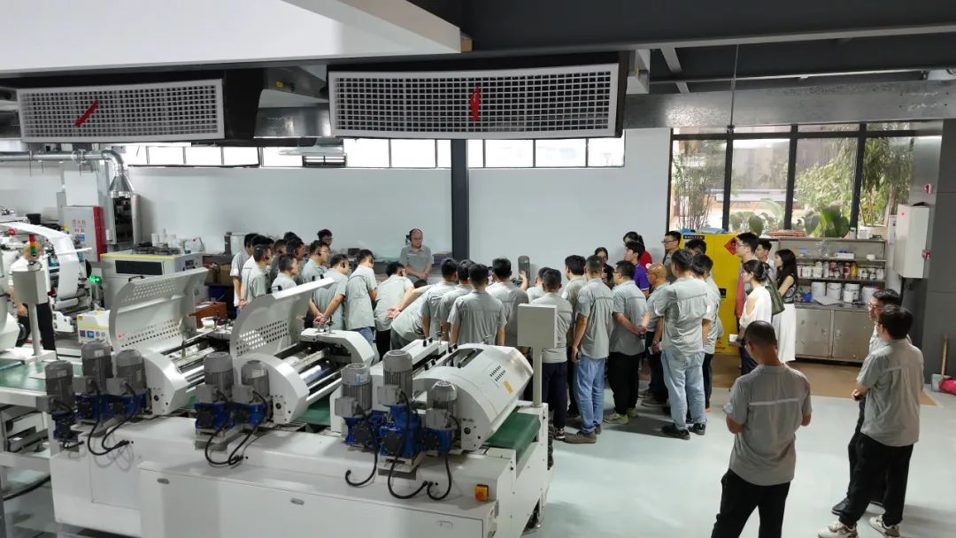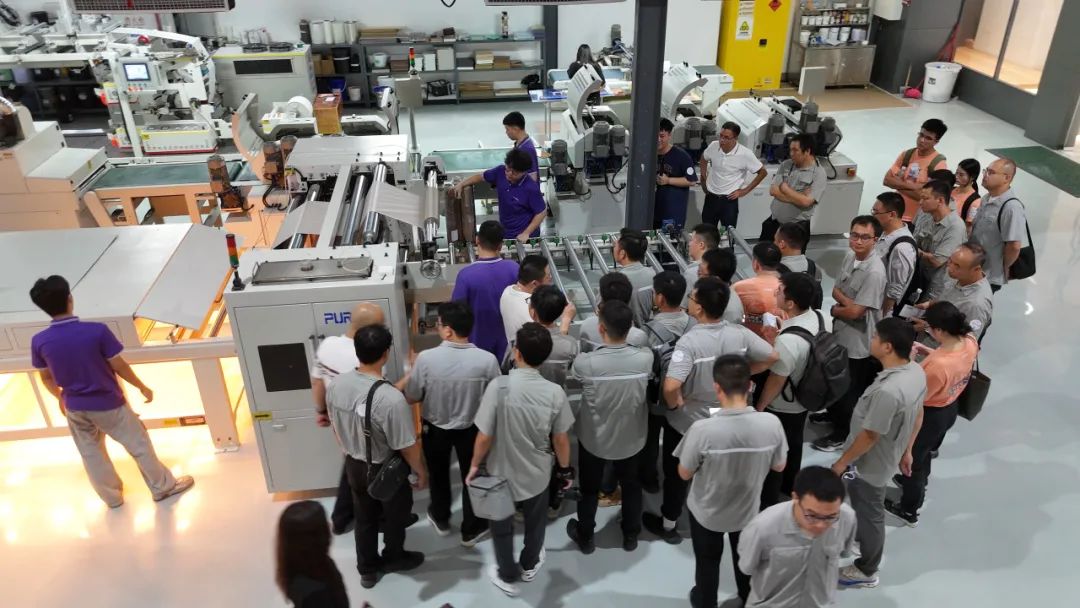 考察團(tuán)分成兩組深入生產(chǎn)一線,開(kāi)啟深度參觀。在專業(yè)引導(dǎo)員的引領(lǐng)下,從機(jī)加車間到裝配1車間,再裝配3車間內(nèi),先后參觀了輥涂、淋涂、噴漆、平貼、平壓等各個(gè)產(chǎn)線設(shè)備。這些先進(jìn)的設(shè)備和智能化的生產(chǎn)流程,讓工程師們對(duì)表面涂飾工藝有了更直觀的認(rèn)識(shí),也感受到了普瑞特在智能制造領(lǐng)域的強(qiáng)大實(shí)力。
